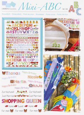 Stickvorlage "Mini-ABC". Ideal für die individuelle Gestaltung mit persönlichen Daten von Schriftbändern, Frottierware, Schultüten uvm. Bogen mit 4 Seiten, inkl. Grundanleitung und farbiger Zählvorlage. Größe: 21 x 29,5 cm.