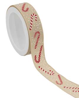 Stoffband "Zuckerstange", Farbe: creme-rot, Breite: 25 mm, 5 m pro Rolle. Material: 100 % Polyester.