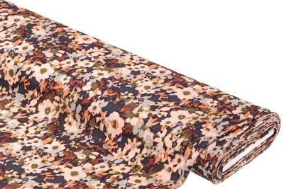 Stretch-Blusenstoff "Blumen", Farbe: braun-color, querelastisch, Motivgröße Blume creme groß: 5 cm Ø, Breite: 165 cm, Gewicht: ca. 190 g/m². Material: 80 % Viskose, 20 % Polyamid.