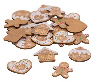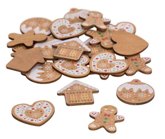 Streuteile "Lebkuchen" aus Holz, 4 verschiedene Motive, Größe: 4 cm, Inhalt: 24 Stück.