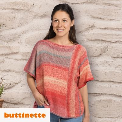 Strickanleitung – Asymmetrische Tunika aus Woll Butt Lexy. Wohlgefühl pur verspricht diese Tunika! Der lässige, asymmetrische Schnitt lässt Sie frei atmen und sorgt dafür, dass nichts einengt oder sich staut. Optisch stehen sich eine quer- und längsgestrickte Seite gegenüber die je glatt rechts gestrickt mit kraus rechten Bündchen gearbeitet wird. So entsteht ein äußerst harmonisches, farbenfrohes Maschenbild.