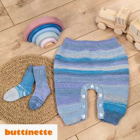 Strickanleitung – Babyhose & -söckchen aus Woll Butt Primo Merino Cotton. Diese Hose ist ein echtes Lieblingsstück – schlicht kraus gestrickt aus weichem Merino-Cotton-Mischgarn mit schönem Farbenspiel. Die blaue Hose reicht bis zur Taille und sitzt bequem. Eine praktische Knopfleiste an der inneren Beinnaht erleichtert das Windelwechseln. Damit auch die kleinen Füßchen schön warm bleiben, gibt es passende Söckchen dazu – ebenfalls im gleichen Garn und Stil gestrickt.