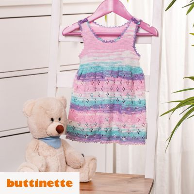 Strickanleitung - Babykleid aus Woll Butt Lilia. In der Familie oder im Freundeskreis gibt es (bald) ein kleines Mädchen? Dann schnappen Sie sich doch gleich Ihre Stricknadeln und stricken Sie drauflos! In diesem niedlichen Kleidchen wird die Kleine bestimmt zauberhaft aussehen: Das Rockteil wird im Streublümchenmuster gestrickt, das Oberteil glatt rechts. Herzknöpfchen als Schulterverschluss und die mit Picots umhäkelten Ausschnitte runden das süße Kleidchen ab.