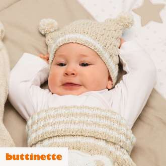 Strickanleitung – Babymützchen Venia. Da möchte man am liebsten selbst wieder Baby sein, so niedlich ist das Mützchen, das im Ballonmuster gestrickt wird und mit zwei kleinen Pompons verziert wird. Dazu passt gut ein Pucksäckchen aus derselben Qualität, nämlich der kinderfreundlichen Woll Butt Venia.
