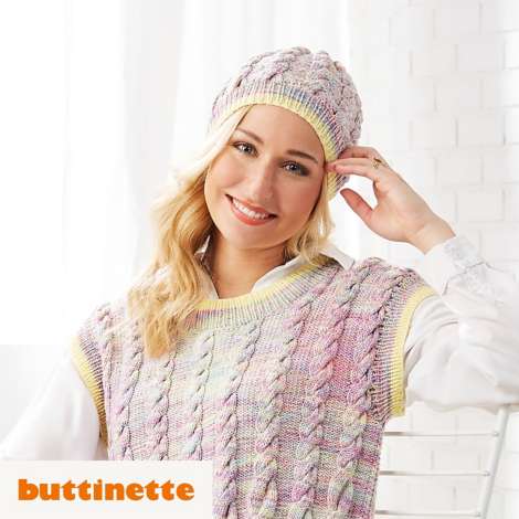 Strickanleitung – Beanie aus Woll Butt Primo Madeleine. Diese Beanie ist perfekt für die Übergangszeit: Aus reiner Schurwolle gestrickt, wärmt sie den Kopf. Die verschieden langen Zopfstreifen heben sich von der glatt links gestrickten Fläche ab und bringen Bewegung in die Masche. Stricken Sie dazu den passenden Slipover!