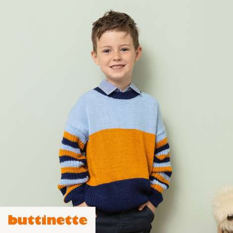Strickanleitung – Jungenpullover aus Woll Butt Versailles. Wow! Cool und schick zugleich kommt dieser gerade geschnittene Jungenpullover daher! Während Vorder- und Rückenteil glatt rechts gestrickt werden, sind die Ärmel im Halbpatent gehalten. Die Mischung aus breiten Blockstreifen und schmalen Ringeln bringt Abwechslung ins Strickvergnügen und begeistert nicht nur Anfänger:innen.