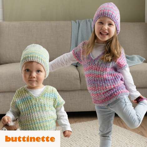 Strickanleitung – Kinderpullunder aus Woll Butt Venia. Pullunder sind ideal zum Drüberziehen, ob daheim oder im Kindergarten – und wenn sie so kuschelweich sind wie diese, werden sie auch bestimmt gerne getragen! Zudem wachsen die Unisex-Pullunder dank der lässigen Passform mit überschnittenen Schultern und weitem V-Ausschnitt einige Zeit mit. Gestrickt wird im Rippenmuster mit Hebemaschen; die passende Mütze in glatt rechts ist auch für Anfänger:Innen perfekt zum Warmstricken.