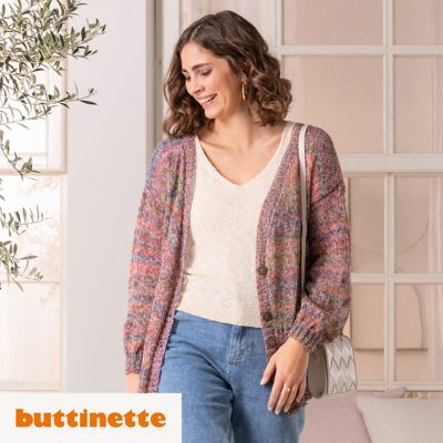 Strickanleitung – Oversized Cardigan aus Woll Butt Felia. Dieser gerade geschnittene Oversized-Cardigan mit V-Ausschnitt wird garantiert Ihr neues Lieblingsteil für laue Sommerabende. Er wird glatt rechts gestrickt und dank Colorgarn ohne viel Aufwand herrlich bunt. Die Rippenbündchen an den Säumen, die angestrickte Blende entlang der Ausschnittkante und die Knopfleiste geben dem Cardigan den letzten Schliff.