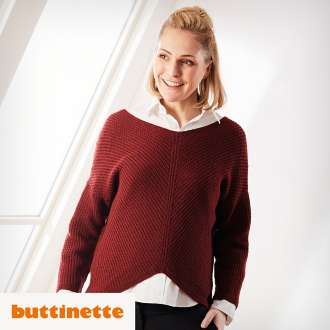 Strickanleitung – Oversized Pullover mit Schrägverlauf Madeleine. Urbaner Chic – und so gemütlich: Der Oversized-Pullover aus feinster Merinowolle Woll Butt Primo Madeleine ist sowohl optisch als auch vom Tragekomfort her eine Wohltat. Der weite V-Ausschnitt korrespondiert wunderbar mit dem schräg zur Mitte hin verlaufenden Rippenmuster; die angeschrägte Vokuhila-Saumlinie eignet sich perfekt für ein Styling im Lagenlook.