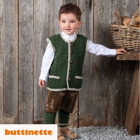 Strickanleitung - Trachtenweste aus Woll Butt Tirol. Auch der Nachwuchs hat sich herausgeputzt und seine Trachtenweste ganz klassisch zu Hemd, Lederhose und Loferl kombiniert. Die Kinderweste ist das Gegenstück zur Herrenweste und in Design und Machart ähnlich.