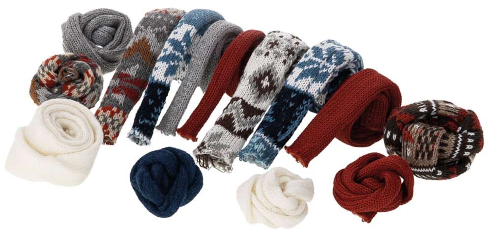 Strickschlauch-Paket "Norwegermuster", Farben: rot, weiß, grau, blau, braun mit gestricktem Norwegermuster, Breiten: 1,5, 2 und 3 cm, Inhalt: 14x 50 cm. Material: 100 % Polyester.