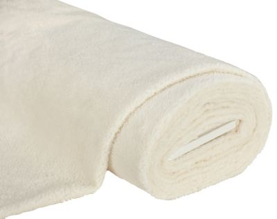 Teddyplüsch in Lammfelloptik, mit glatter Rückseite, Florhöhe: 10 mm, Farbe: wollweiß, Breite: 150 cm, Gewicht: ca. 225 g/m². Material: 50 % Polyacryl, 50 % Polyester.