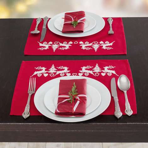 Tischsets "Hirsche rot/weiß", im 2er-Set, zum Besticken in Kreuzstich. Vorgedrucktes Motiv, randfertig gesäumt. Komplettpackung: Anleitung, Garn, Sticknadel. Stofffarbe: rot. Größe: 35 x 45 cm. Material: Stoff 50 % Baumwolle, 50 % Leinen, Garn 100 % Baumwolle.