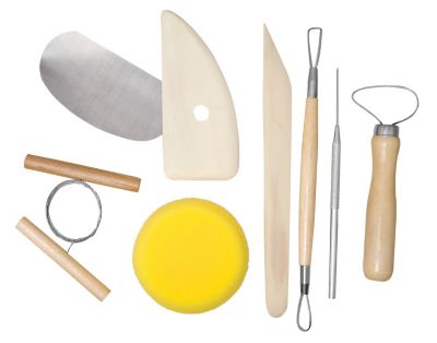 Töpferwerkzeug-Set, Größe: 8 - 20 cm, 8-teilig, Inhalt: Abdrehschlinge, Modellierschlinge, Modellierholz, Töpfernadel, Abschneidedraht, Polierblech, Drehschiene und Schwamm.