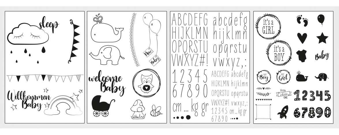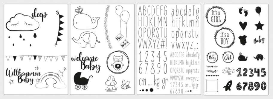 Transfermotive-Set mit Vorlagen, Inhalt: 4x Vorlagen "Baby", 5x DIN A4 Transferpapier.
