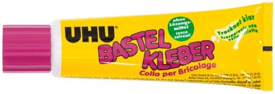 UHU Bastelkleber, ein transparent auftrocknender Klebstoff ohne Lösungsmittel. Klebt schnell Papier, Pappe, Leder, Trockenblumen, Bast uvm. Inhalt: 90 g.