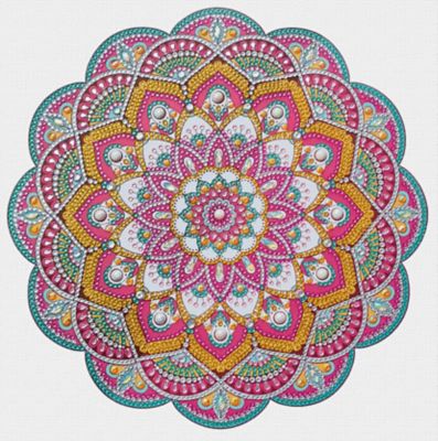 Ursus Diamantenstickerei "Mandala pink", bestehend aus einem Keilrahmen mit Mandalaaufdruck, Größe: 30 x 30 cm, Perlen ausreichend für das vorgedruckte Motiv mit einer kleinen Reserve zusätzlich, Perlenpicker mit Wachs, Perlenbehälter, Pinzette und ein Montageset.