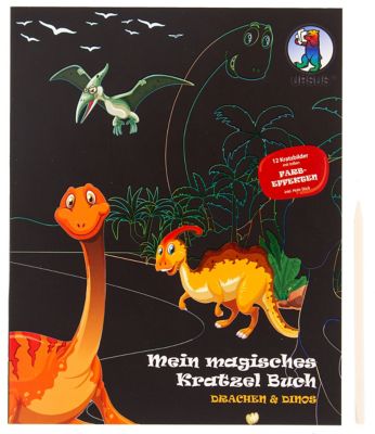 Ursus Kratzel Buch "Drachen & Dinos", Inhalt: 12 Kratzbilder, 12 Mandalas zum Ausmalen auf der Rückseite, 1 Holz-Stick, Größe: 21 x 26 cm.