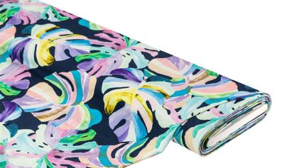 Sie hätten gerne mehr tropisches Flair in Ihrem Kleiderschrank? Dann haben wir hier etwas für Sie: Dieser Viskose-Jersey ist über und über mit bunten Monstera-Blättern bedeckt! Die tropische Zimmerpflanze liegt voll im Trend und die bunten Farben der Blätter bilden einen schönen Kontrast zu dem marinefarbenen Hintergrund. Nähen Sie aus diesem Jersey-Stoff Tops, Shirts, Kleider oder Röcke – und freuen Sie sich über jede Menge Komplimente! Der Viskose-Jersey sieht aber nicht nur toll aus – er fühlt sich auf der Haut auch herrlich weich an, hat einen leicht kühlenden Effekt und macht jede Bewegung mit. Heute bestellen und schon bald losnähen!