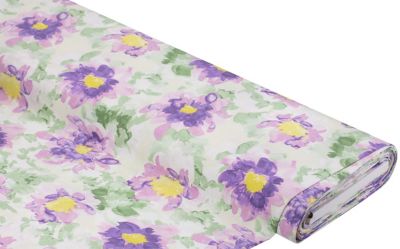 Viskose-Leinen "Blumen", Farbe: ecru/lila, Motivgröße Blume lila: 8 cm Ø, Breite: 130 cm, Gewicht: ca. 215 g/m². Material: 70 % Viskose, 30 % Leinen.