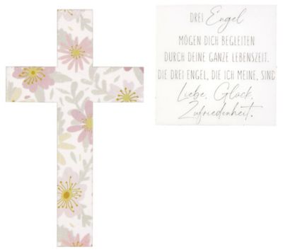 Wachsmotive "Blumenkreuz mit Spruch", zum Verzieren und Gestalten von Kerzen, Farbe: bunt, Größe: Kreuz 11 x 7 cm, Spruch 6 x 6 cm, Inhalt: 2 Stück.