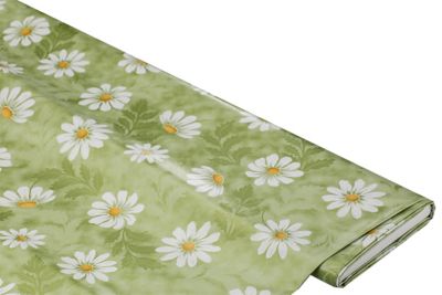 Wachstuch "Gänseblümchen", Farbe: grün-color, Motivgröße Blumenkopf: 6,5 cm Ø, Breite: 140 cm, Gewicht: ca. 310 g/m². Material: Grundmaterial 100 % Polypropylen, Beschichtung 100 % Polyvinylchlorid.