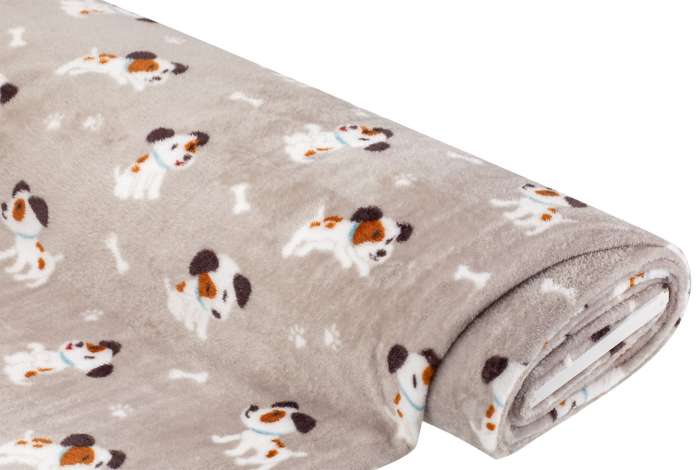Herrlich weiches Wellness-Fleece "Hunde", Farbe: greige-color, Motivgröße Hund: 7–9 cm, Florhöhe: 7 mm, Breite: 150 cm, Gewicht: ca. 260 g/m². Material: 100 % Polyester.