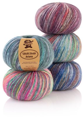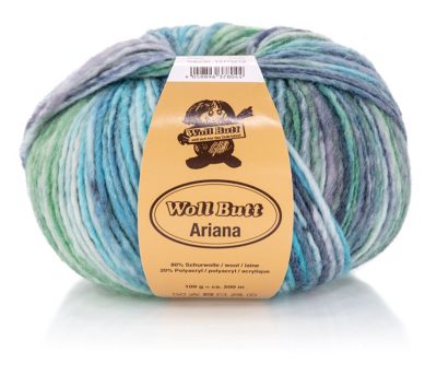 Woll Butt Ariana - Garn-Set. Mit Ariana stricken Sie sich im Nu ein komplettes Winter-Set bestehend aus einer warmen Mütze und einem kuscheligen Schalkragen; nur zwei Knäuel und die Anleitung in der Banderole genügen dafür. Die weiche Dochtstruktur macht das Stricken besonders angenehm und sorgt für ein gleichmäßiges Maschenbild. Besonderes Highlight ist der raffinierte Spraydruck, der jeder Colorfarbe Tiefe und Bewegung verleiht – von dezenten Naturtönen bis zu kräftigen Highlights. Überzeugen Sie sich selbst und freuen Sie sich auf tolle Winterprojekte zum Wohlfühlen!