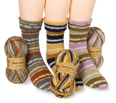 Dieses Sparpaket enthält Wolle für 3 Paar Socken in den Color-Farben: terra, ocker und flieder.
