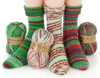Dieses Sparpaket enthält Wolle für 3 Paar Socken in Grün-Rot color mit verschiedenen Designs.