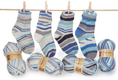 Woll Butt Sockenwollpaket "It's a boy", 200 g. Mit selbstgestrickten Söckchen bekommen Kids eine Extraportion Liebe mit auf den Weg. Und warme Füße natürlich obendrein! Diese Sockenwolle ist perfekt auf die Anforderungen von Baby- oder Kleinkindsöckchen abgestimmt: Ein Paket mit vier 50-Gramm-Knäueln reicht für vier Paar Socken bis Größe 25; der extrakurze Rapport ist extra für kleine Söckchen designt. Das Qualitätsgarn ist temperaturausgleichend, feuchtigkeitsabsorbierend, strapazierfähig, filzfrei und natürlich maschinenwaschbar.