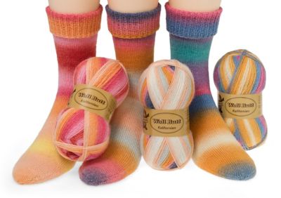 Woll Butt Sockenwollpaket "Kalifornien". Unser bewährtes Sockengarn in Dochtgarn-Ausführung begeistert mit faszinierenden Farbverläufen. Das Garn überzeugt durch seine weiche, hautfreundliche Qualität und hohen Tragekomfort. Es besteht aus einer strapazierfähigen Schurwoll-Mischung mit Superwash-Ausrüstung, ist formstabil, waschmaschinenfest, temperaturausgleich und filzfrei. Der Anteil an Viskose (aus Bambus) sorgt für angenehme Kühle im Sommer. Das vielseitig einsetzbare Garn lässt sich leicht verstricken, ergibt ein gleichmäßiges Maschenbild und eignet sich ideal für Socken, Schals oder Tücher. Dieses Sparpaket enthält Wolle für 3 Paar Socken in Bunt colors.
