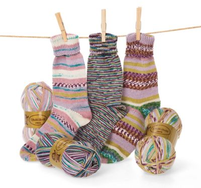 Dieses Sparpaket enthält Wolle für 3 Paar Socken in Rosa color mit verschiedenen Designs.