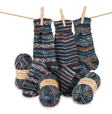 Dieses Sparpaket enthält Wolle für 3 Paar Socken in Braun-Türkis color mit verschiedenen Designs.