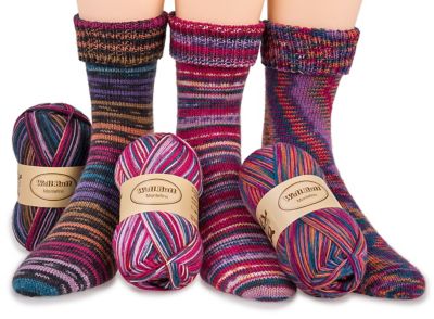Dieses Sparpaket enthält Wolle für 3 Paar Socken in Beere color mit verschiedenen Designs.