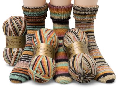 Dieses Sparpaket enthält Wolle für 3 Paar Socken in Orange color mit verschiedenen Designs.