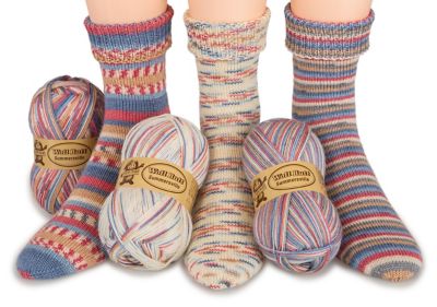 Woll Butt Sockenwollpaket "Summersville". Dieses 4-fädige Strumpfgarn zeichnet sich durch den weichen, angenehmen Griff, hohen Tragekomfort und gute Hautverträglichkeit aus. Im Sommer schenkt es angenehme Kühle dank der darin enthaltenen Viskose (Bambus). Die strapazierfähige Schurwoll-Mischung mit Superwash-Ausrüstung ist formstabil, waschmaschinenfest, temperaturausgleichend und natürlich filzfrei. Dieses Sparpaket enthält Wolle für 3 Paar Socken in Blau color mit verschiedenen Designs.