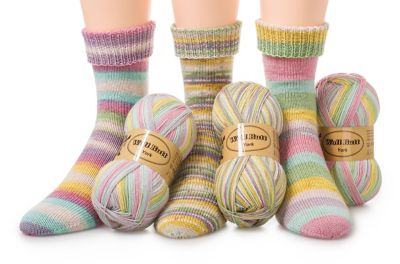 Woll Butt Sockenwollpaket "York". Dieses 4-fädige Strumpfgarn zeichnet sich durch den weichen, angenehmen Griff, hohen Tragekomfort und gute Hautverträglichkeit aus. Im Sommer schenkt es angenehme Kühle dank der darin enthaltenen Viskose (Bambus). Die strapazierfähige Schurwoll-Mischung mit Superwash-Ausrüstung ist formstabil, waschmaschinenfest, temperaturausgleichend und natürlich filzfrei. Dieses Sparpaket enthält Wolle für 3 Paar Socken in Candy color mit verschiedenen Designs.