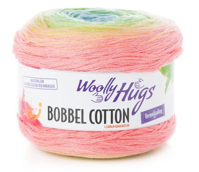Woolly Hugs Bobbel Cotton. Die neue Woll-Qualität der bekannten Handarbeits-Designerin und -Autorin Veronika Hug! Bobbel Cotton, ein 4-fädig gefachtes Garn, wechselt stets in gleichmäßigen Abständen einen einzelnen Faden, wodurch sich die wunderschönen, harmonischen Farbverläufe ergeben. Die winzigen Knoten, die durch das Anknoten der anderen Garnfarbe entstehen, sind im fertigen Modell kaum sichtbar. Jeder Bobbel (schwäbisch für "Knäuel") kann – je nach gewünschter Farbabfolge – von innen nach außen oder umgekehrt verarbeitet werden. Stricken Sie aus Woolly Hugs Bobbel Cotton Tücher, Pullover, Schals uvm., die fantastisch aussehen und dank der ultraweichen Baumwollmisch-Qualität herrlich angenehm zu tragen sind!